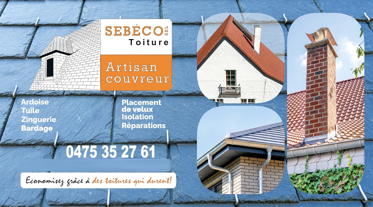 Tel: +32 475 35 27 61 E-mail: info@sebeco-toiture.be Artisan Couvreur depuis 14 ans à Gembloux, se déplace partout en Wallonie. Toitures Eternit, naturelles ou artificielles, Zinguerie, Bardage, Isolation, placement et remplacement de vélux, réparations, — 14 ans d’expérience Demander un Devis